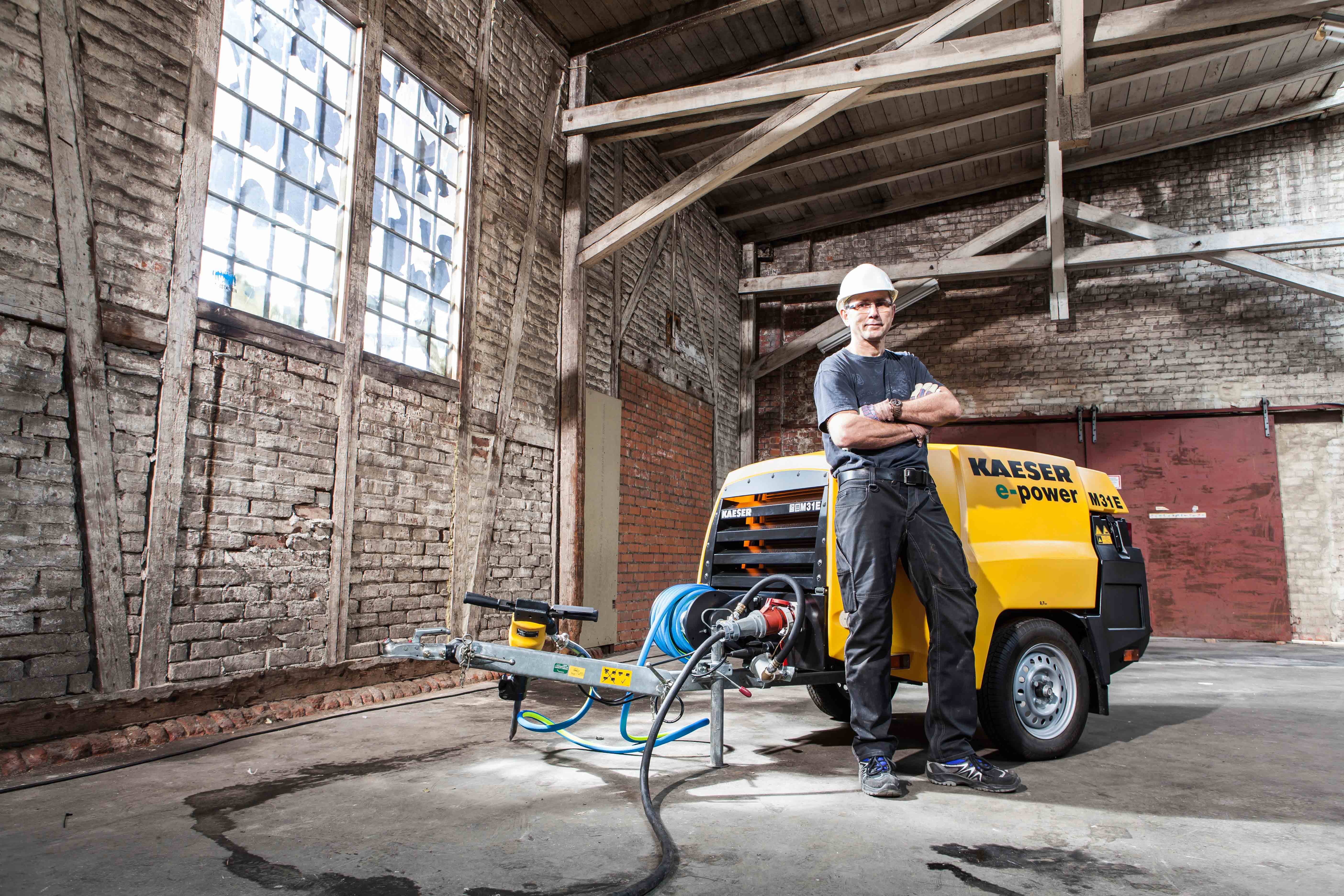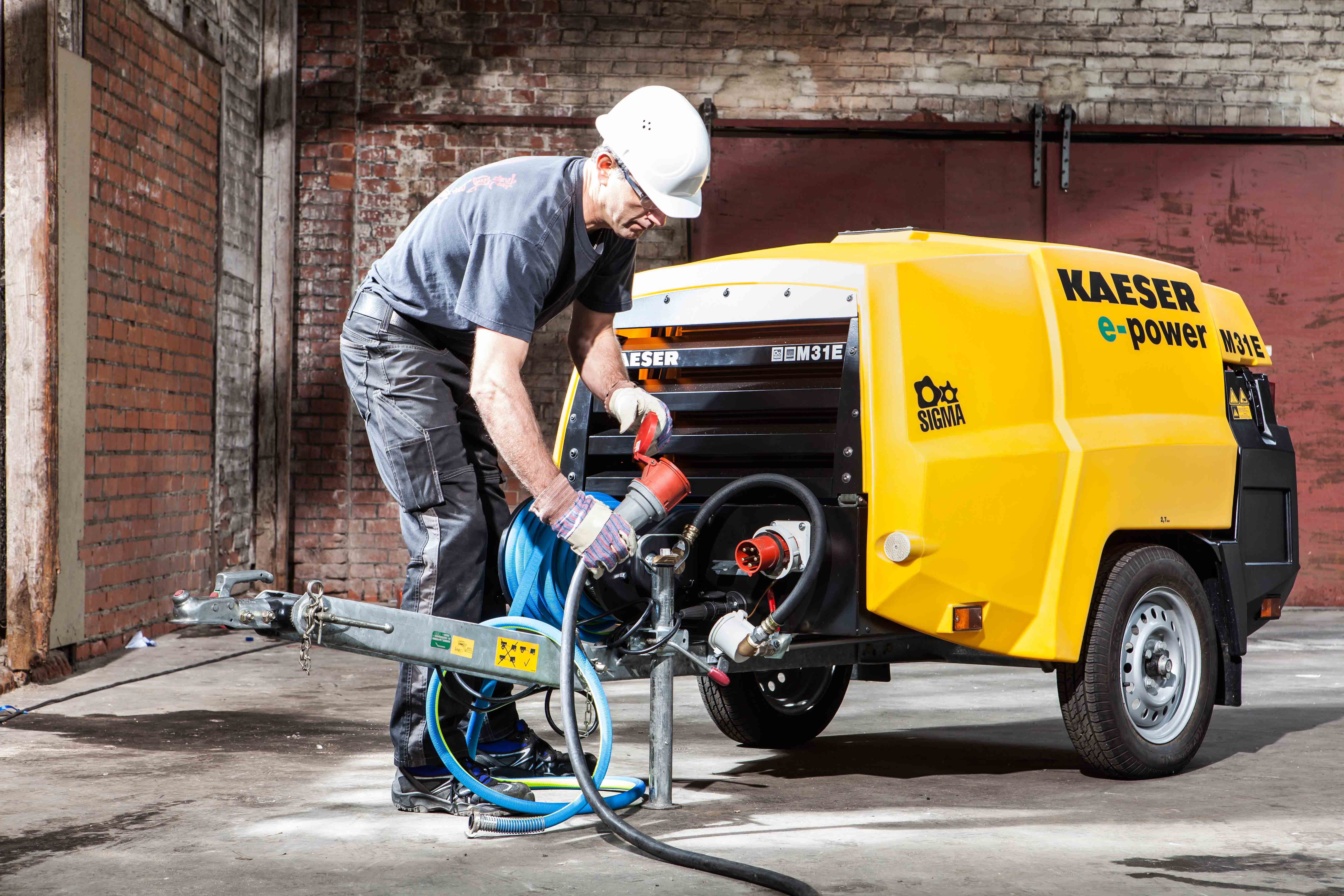 Sur les grands chantiers, en zone urbaine ou à l'intérieur des bâtiments, les compresseurs de chantier à moteur électrique ne rejettent aucune émission de gaz, ils sont silencieux et nettement plus économiques que les modèles diesel. En plus des versions classiques, Kaeser propose désormais les M27, M31 et M50, les modèles plus vendus de sa gamme Mobilair, dans des versions avec un moteur électrique de 15 à 25 kW. Ces machines débitent entre 2 et 5 m³/min à des pressions allant de 7 à 14 bar.