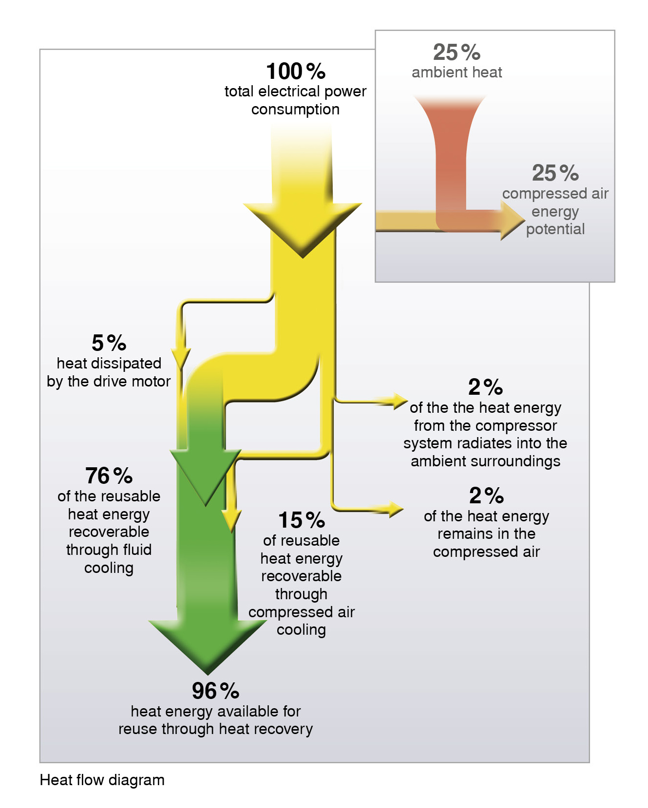 Niet minder dan 100 procent van de aan een compressor toegevoerde aandrijfenergie wordt in warmte omgezet. Voor een zo uitgebreid mogelijke recuperatie en een verder gebruik van deze energie zijn lucht- en vloeistofgekoelde schroefcompressoren zeer geschikt. Bij dergelijke compressoren komt ca. 76 procent van de ingezette energie als warmte terug in koelvloeistof. Die wordt in de vloeistofnakoeler eraan onttrokken. Nog eens 15 procent van deze energie kan als warmte via de persluchtnakoeler teruggewonnen worden. De elektromotor geeft tot 5 procent als warmteverlies af. Volledig omhulde schroefcompressoren maken het zelfs mogelijk om met een gerichte koeling zelfs dit energieaandeel terug te winnen. Daarmee is tot 96 procent van de oorspronkelijk toegevoerde aandrijfenergie weer geschikt voor hergebruik. Slechts ca. 2 procent gaat door warmtestraling verloren en ca. 2 procent blijft als warmte in de perslucht achter.