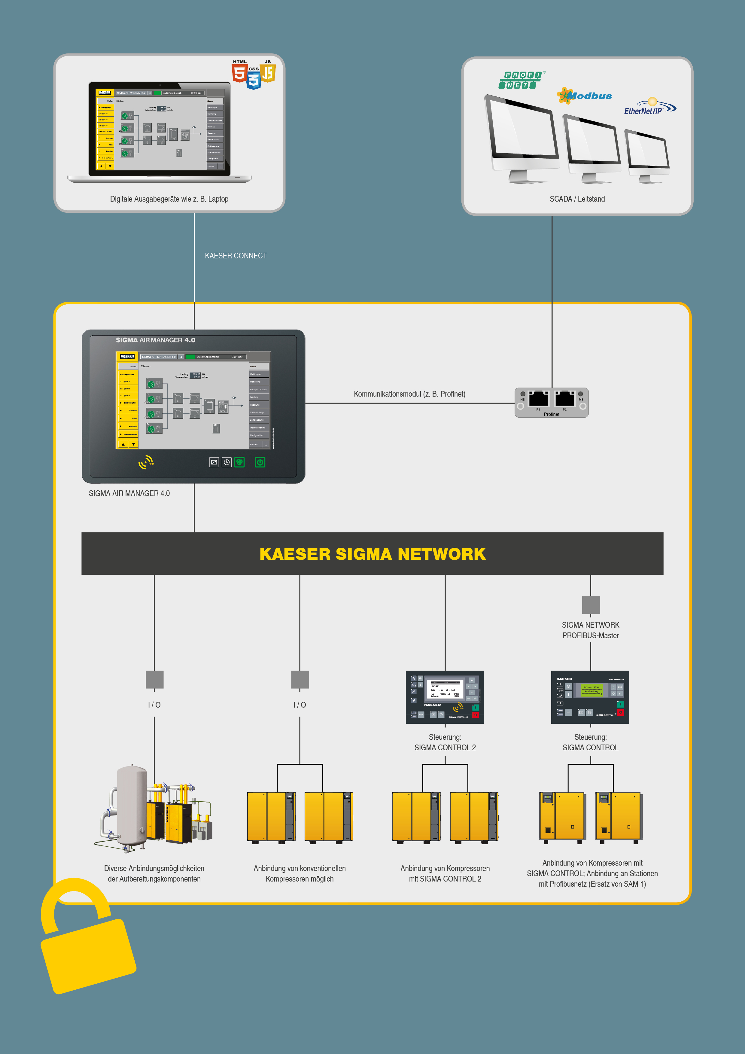 Le Sigma Network forme, avec la commande prioritaire Sigma Air Manager 4.0, une infrastructure parfaitement étudiée pour rendre des données disponibles pour des services d'avenir comme la maintenance anticipée ou le management de l'énergie. Il en résulte une baisse des coûts et une amélioration de la disponibilité et de la sécurité de fonctionnement.